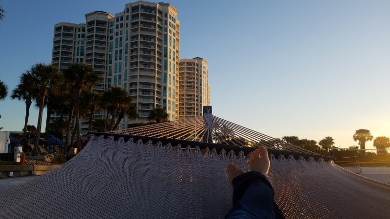 After his workday was over we'd meet up and he'd ask how my day was. I'd try not to rub it in by saying dismissively, "Oh, I just watched the sun set from the hot tub. How was your meeting?"